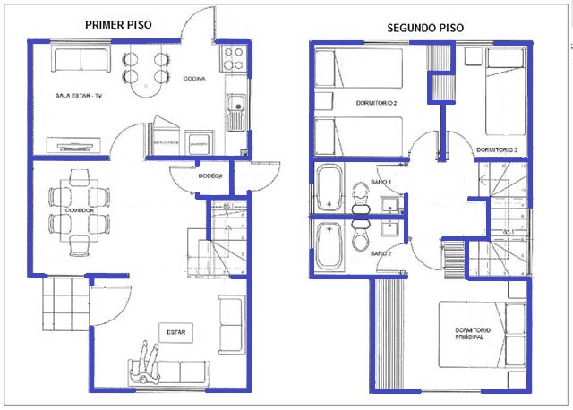 1°piso: estar, comedor, cocina comedor, despensa. 2°piso: 3 dormitorios y 2 baños (uno en suite).